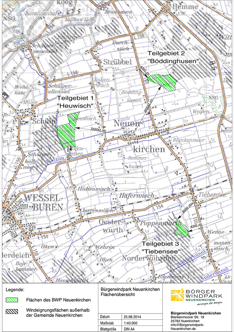 So wurde im Jahr 2011 von der Gemeindevertretung eine Bürgerabstimmung über die Ausweisung von Windeignungsgebieten in Neuenkirchen initiiert. Nach dem positiven Votum der Bürger der Gemeinde Neuenkirchen, wurden somit insgesamt 4 Teilflächen als Vorschlag zur Ausweisung von Windenergieeignungsflächen das Land Schleswig- Holstein gemeldet. Im Dezember 2012 wurden dann die Vorschläge zum großen Teil, aber leider nicht im vollen Umfang vom Land übernommen und als Windeignungsgebiet in den Regionalplan des Landes Schleswig-Holstein ausgewiesen. Von jetzt an war klar, das aus der Idee auch Wirklichkeit wird.